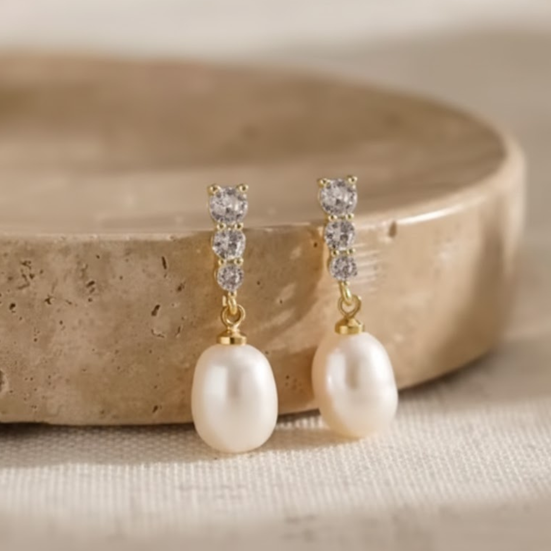 Helene are the earrings that combine luxury and subtle elegance. The three hand-set sparkling stones catch the light in a beautiful, sophisticated way, while the natural freshwater pearls give the jewelry a warm and timeless feel. The result is an exquisite design that highlights the face with a feminine and modern glow.